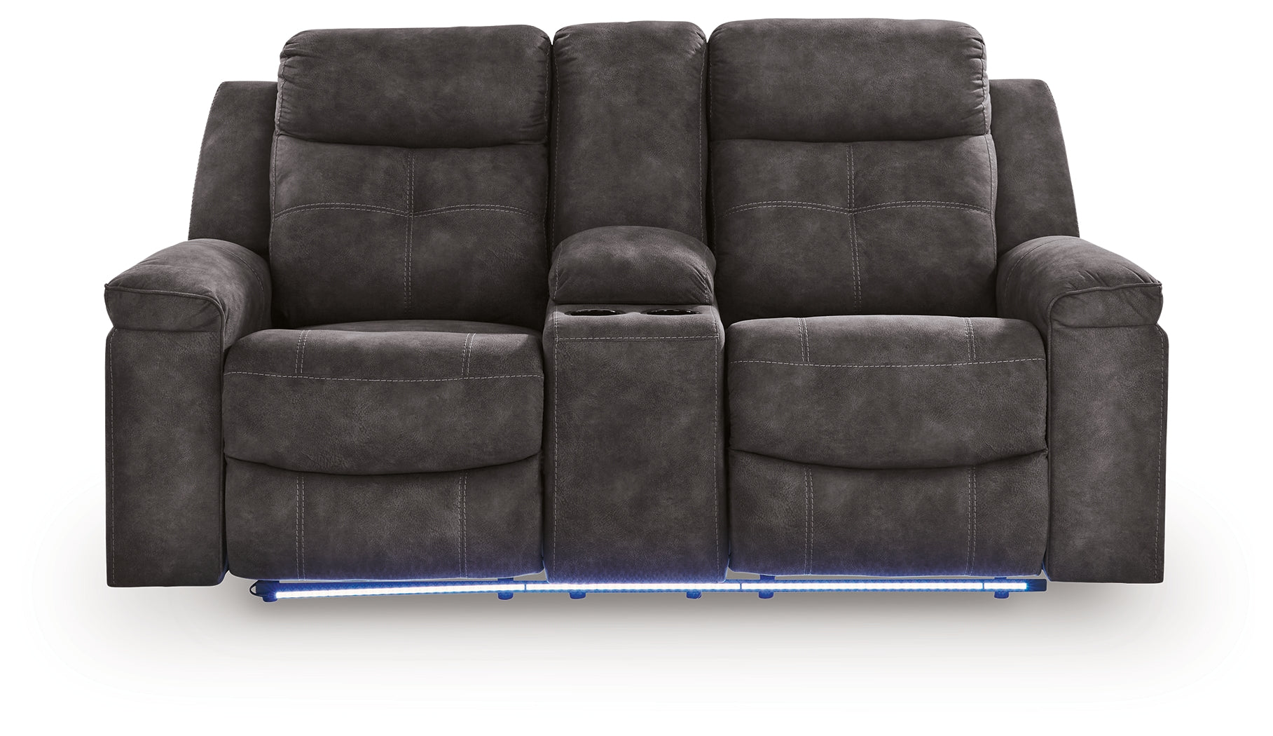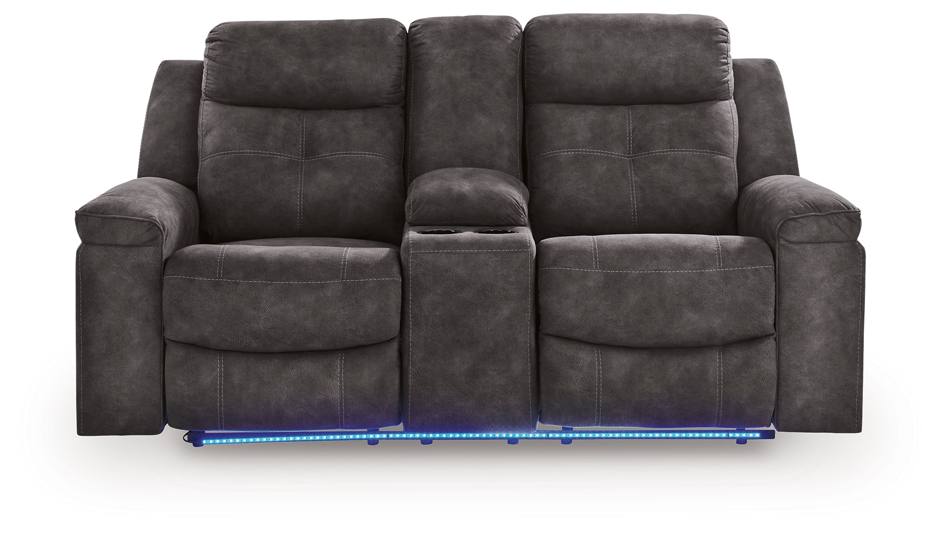Seamlessly blend contemporary aesthetics and uncompromising comfort with this reclining loveseat. Its handsome charcoal-hued faux leather has a tailored appeal thanks to sizable stitching details. As for modern convenience? The simple one-pull reclining and ambient LED lighting encourage you to relax in style.
