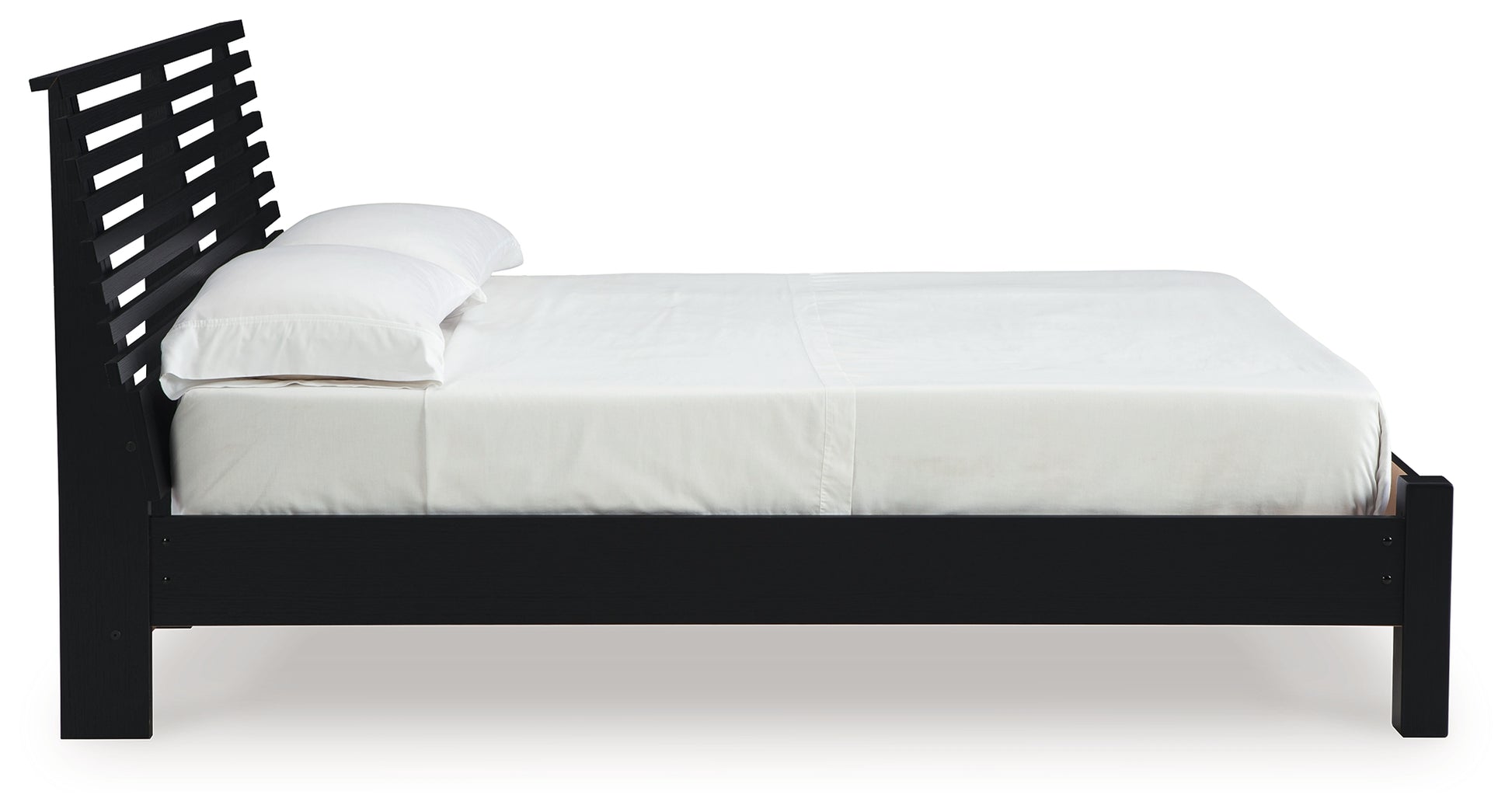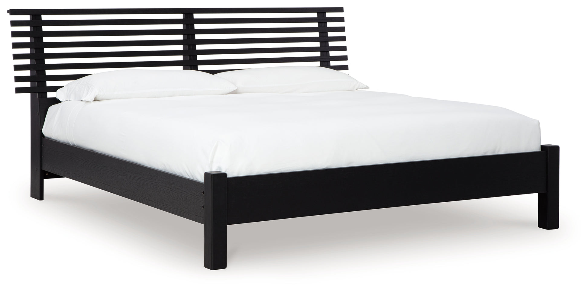 Sophisticated style for the savvy shopper. This slat panel bed prioritizes affordable, on-trend design. Its subtle replicated texture recalls the natural beauty of wood, highlighting the slatted styling. And a matte black finish suits different approaches to modern aesthetics. Mix and match with light and bright hues, or pair with other dark tones for a moody look.