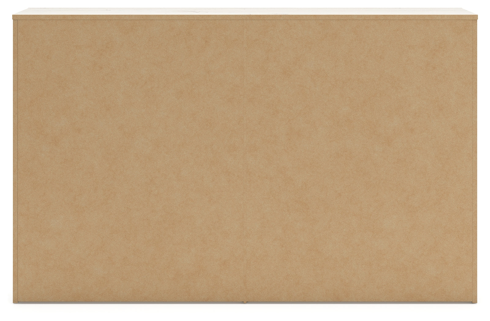 - Drawer interiors are lined with a faux linen laminate for a clean, finished look
