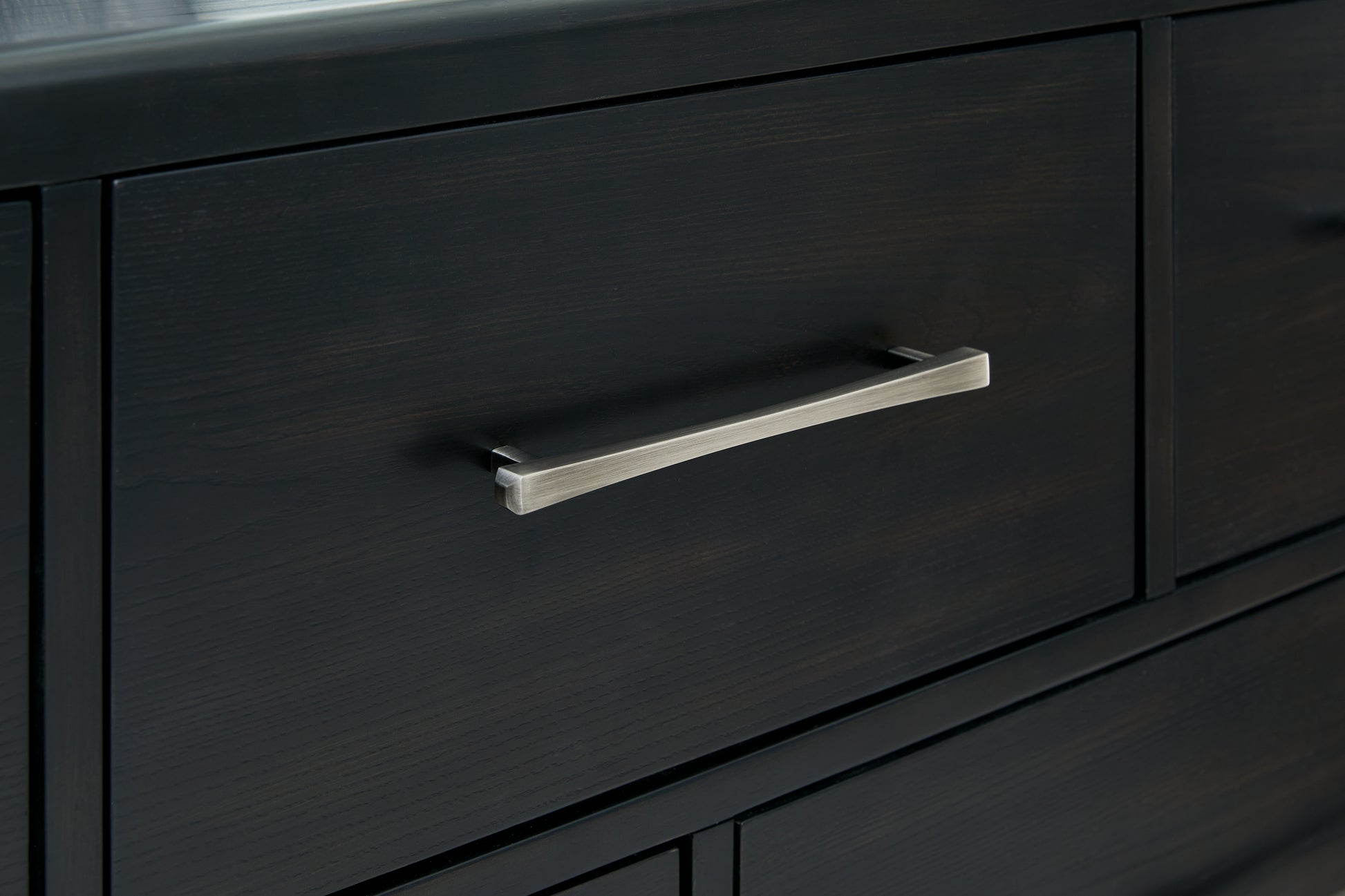 Inspired by art deco design, this softly shaped queen upholstered panel bed makes a lasting impression in a simply stunning way. Its magnificent curved silhouette is enhanced by a rich layered black finish on the textured wood grain surface. The channeled vertical headboard and footboard, wrapped in herringbone textured upholstery, merge form and function. This is the statement piece you’ve been dreaming of to elevate your contemporary inner sanctum.